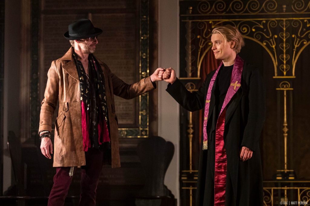Flirtatious — through and beyond the script, their complicity as actors comprehend the audience, designing an entertaining, almost belletrist, `travesty` of their teenaged characters intimacy. Agents of this dramatic, yet far from dramatical, translation into the now, are a crew of `in-and-outers`.